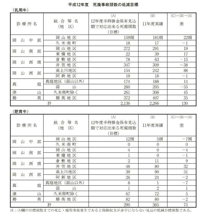 死亡,廃用事故の低減を図るため,別表の「死廃事故頭数の低減目標」を定め,関係機関,団体の連携により家畜臨床研修所,家畜診療所が中心になって特定損害防止事業,一般損害防止事業を強化する。