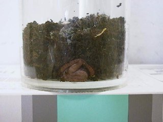 暗所を好むミミズは,覆いを取って周囲が明るくなると堆肥の中に潜りますが,未熟な堆肥では,潜ろうとせず,逃げようとコップ面をはい回ったり,堆肥の上でぐったりしています。(写真1)。腐熟がすすんだ堆肥では潜ります(写真2)。