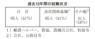 過去10年間の卒業生231名の進路を表に示しました。近年は酪農後継と畜産関係への就職が同数となりましたが,併せて82%が畜産関係に進んでいます。