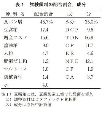 飼料原料の配合割合及びその成分値は表1に示した。作成行程は,材料搬入→パン屑等粗大材料の粉砕→攪拌混合→袋詰→密封→保存とした。なお,乳酸菌の添加は,乳酸菌添加豆腐粕を使用したため特に行わなかった。また,密封時には掃除機による脱気を行い,腐敗防止に努めた。