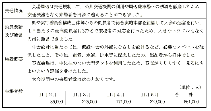 開催に当たっては,大会初日が大雨,洪水,暴風警報が発令される中で,オープニングセレモニーのテープカットが行われるなど,幾多の困難がありましたが,午後からは天気も回復して,5日の最終日まで,晴れの国の面目躍如の天候に恵まれ,来場者も予定した数を上回った上に,岡山県の成績もかってない成果を上げ,成功裡に閉幕しました。