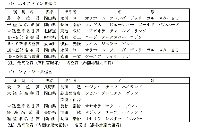 共進会における最高位賞,名誉賞及び準名誉賞は次のとおりで,ホルスタイン種,ジャージー種とも岡山県の出品牛は立派な成果を収めましたが,これは,出品者のたゆまぬ努力はもとより,全国大会へ出品できなかった人達も,支援者となって手助けされ,また,関係農協等の方々も熱心に補助されたチームワークの良さの成果だと思われました。