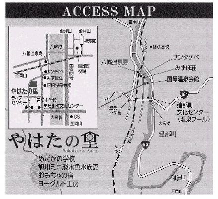 「やはたの里」は,建部町の二大観光地の一つである「八幡温泉郷」の魅力アップを図るため,今まで分散状態にあった観光ポイントを集約し,自然の不思議・あそびの歴史等を子供も大人も一緒に学ぶことの出来る集合型体験施設として,「めだかの学校・旭川ミニ淡水魚水族館」の敷地内に「おもちゃの宿」と「ヨーグルト工房」を移転し,温泉郷と併せ4施設1体となりました。