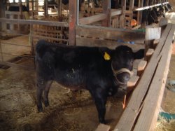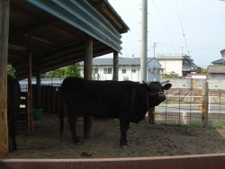 | 和牛専用の運動場(後ろには住宅が密集している) | 十分な愛情を受け良好な発育を示す和牛子牛 |