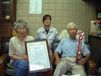 | 去勢最高位のトロフィーと賞状を手にし喜ぶ藤原さん夫婦と,中央はJAあかいわ営農指導員の稲井さん | |