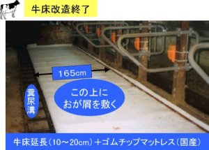 2.5uの牛床(1.5×1.7m)が乳牛にとっての生活場所です。その場で寝起きをし飲食(反芻)・排せつ・搾乳・種付け・分娩が行われます。ですから牛床の改善は牛を長持ちさせることにもつながります。