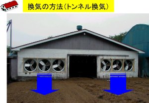 閉鎖式牛舎の多い北海道では,片方の壁だけに換気扇を設置し,一方向に換気するやり方「トンネル換気」が主流になっています。冬もインバーター調整により24時間稼働させ,牛舎の換気と除湿を図っています。