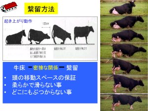 牛は起きあがるとき,首を前に伸ばした反動で後ろ足から立ち上がりますが,この動作に支障のない繋留方式とする必要があります。