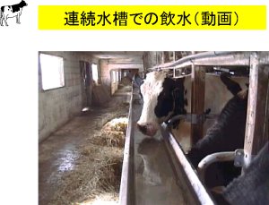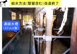 この時,全頭に十分に水が行き渡るように,また,2頭に1個のウオーターカップで,弱い牛が飲みにくい場合を解消する手段として,連続水槽(大型のステンレス製のトイ)が馬せん棒に固定して設置されています。