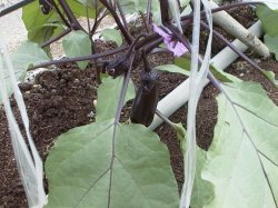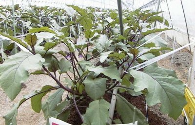 ナスの栽培面積はハウス面積で17aになり,ハウス2棟でナスの栽培を行っています。ナスの品種は千両ナスで,ハウス栽培は露地栽培とは異なり,10月から翌年6月までの約9ヶ月間続けて収穫します。ナス1本の木より約300から350個穫れるそうです。苗の植え付けは9月に行います。収穫は花が咲いて2〜3週間経ったぐらいからで,10月ぐらいから6月までナスの出荷を行います。ナスの収穫量は10a当たり17tになります。