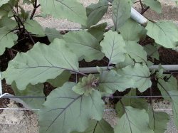 ナスの生育は旺盛で,ハウスで栽培されている様子を見ると,葉っぱなんか非常に大きくて驚いてしまいます。高さは人の身長くらいまで生長させます。もっと高くなるようですが,収穫する人のことを考えて人の身長ぐらいにしているそうです。