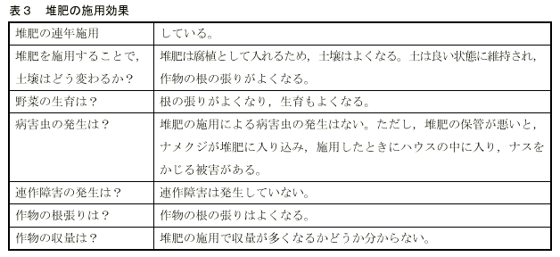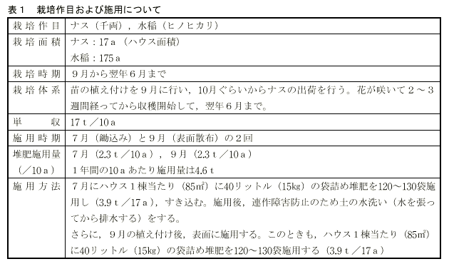 大塚さんは,ナスの栽培に,堆肥からの栄養分はあまり欲しくないそうで,腐植としての価値が大切だと考えられています。そのため,大塚さんの求める堆肥は,腐植が進んで窒素成分が少ない堆肥だそうです。堆肥の施用目的は土壌中の腐植を増やし,土壌を改良することを第一に考えてられています。