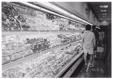 スカイ・ショッピングセンターには,付表に示していないが,白菜,大根,キャベツなどの野菜類が豊富にあり,豆腐や漬け物,そして冷凍の水産物,鮨たねまでも並んでいる。トレイに盛った米飯,炒め肉とハルサメの弁当に海苔巻き4切れが添えてあった。弁当の値段は日本円換算172円で,夕食用に持ち帰り海苔巻きを口にしたが,酢味がなく驚いた。乳・肉食文化のこの国には酢の文化は育っていないのである。