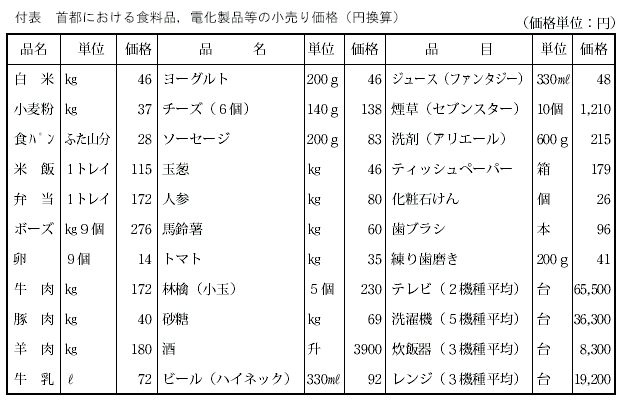 スカイ・ショッピングセンターの食材,嗜好品,電化製品など一部の値段を示すと付表のとおりである。モンゴル人が主食とする肉類の中で最も好む羊肉1キロの値段は上述した公務員月収平均33ドルの4.4%,牛肉では4.2%,豚肉では1.0%,同じく主食の小麦粉では0.9%に相当する。ちなみにわが国の場合,主食の米(5キロ1880円)の値段は月収25万円の場合は0.15%に相当する。こうした数字から,首都の主食の値段は高く,エンゲル係数が家計をおびやかしている実態を垣間見ることができる。