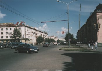 | 市街地目抜き通りを走る車。現在,国内の乗用車台数は10万台,うち4万台は首都に集まる。車が吐き出す騒音と排気ガスは著しい。この10年間に乗用車は急増し,車の便利は「負」の世界を引きずっている。2001年夏に写す。 |