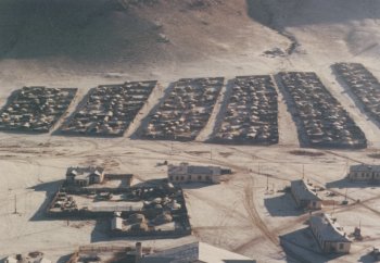 | 社会主義時代,都市住民の住居はゲルからソ連の支援で建築された高層アパ−トへと移っていった。写真はゲル集団で,個々のゲルは板柵で囲い込まれている。この団地はその後解体され,今は草原となり,夏にはムンフツェツェグ(エ−デルワイス)が咲き乱れている。1982年冬に写す。 |