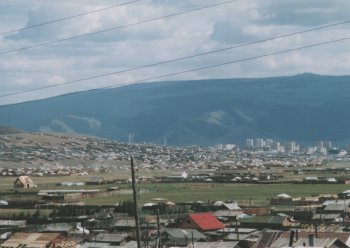 | 首都市街地に隣接する丘陵地帯にゲル団地がガン細胞のように増殖を続けている。写真右手の高層ビルはアパ−ト,左手丘陵地の建物群はゲル団地。2001年夏に写す。 |