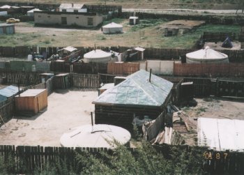 | 板塀に囲まれた借地にゲルや煉瓦積み家屋,木造小屋が建つ。2001年夏に写す。 |