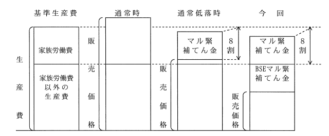 生産者,県及び国が基金を造成し(造成比率;1/8,1/8,3/4),肥育牛1頭当たりの所得が家族労働費を下回った場合に基金から差額の8割を補てんする。(13年度中は四半期毎の交付,14年度から毎月交付)