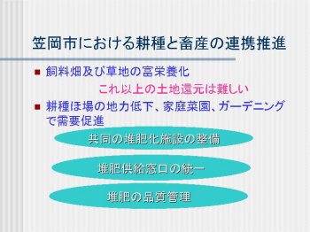 大規模化がすすむ中で,笠岡市,県及び畜産農家は,畜産農家の経営内で堆肥の消化を促進させる方法を模索している。