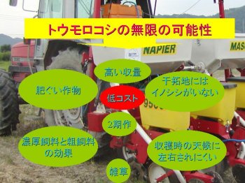 今年度,総合畜産センターの協力により,干拓地におけるトウモロコシ2期作の実証を行っており,7月8日現在(3月末播種)の草丈は250〜270pと旺盛な生育となっている。早い品種では,収穫適期直前である。収穫調査を実施し,干拓地に合った品種選定ができればと思っている。2期作の播種が間近に迫っている。