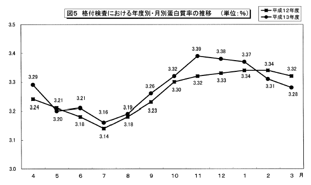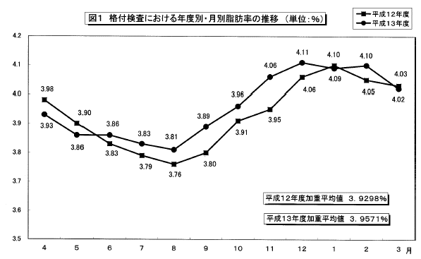 次に,年度別月別の脂肪率の推移をみてみると,13年度は12月から2月に最高値を示し以降低下傾向を示しています。最低値は8月の3.81%でした。平成13年度の最高値と最低値の差は0.3%であり前年度の差0.34%よりやや小さくなっており,前年度に比較して高めの値で推移したことがうかがえます。