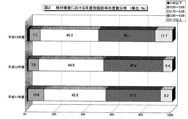 平成11年度から13年度までの脂肪率の度数分布をまとめてみました。11年度は3.50〜3.69%のものが10.9%,3.70〜4.09%のものが80.3%を占め,4.1%以上が8.2%でした。12年度になると,3.50〜3.69%のものと4.1%以上のものが減少して3.70〜3.89%のものが85.8%を占めています。13年度は3.70〜3.89%のものが40.3%,3.90〜4.09%のものが39.1%,4.10%以上のものが11.7%となっています。4.10%以上の占める割合が前年度より5.3%も増え,高脂肪乳の生産がかなり増加したことがうかがわれます。