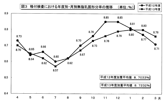 年度別月別の無脂乳固形分率の推移についてみると,13年度は11,12月で8.85%と最高値となり以降低下傾向を示しています。最低値は7月で8.60%になっています。特に11,12月の値は際だって高い値となっています。逆に,1月から下降し前年度を下回っています。
