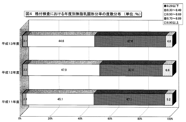 平成11年度から〜13年度までの無脂乳固形分率の度数分布をまとめてみました。3年間をとして,8.50%〜8.89%のものが,おおむね90%前後を占めており度数分布に大きな変化はみられません。