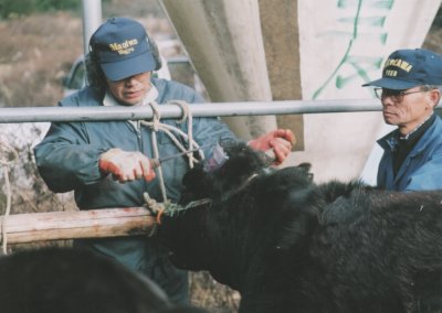 研究会では平成11年に除角研修会を開催し,3戸73頭を除角したのを皮切りに,毎年定期的に除角巡回を実施しており,現在までに真庭郡内の約150頭を除角しています。