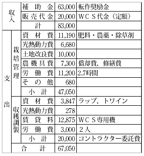 10aあたりの経営収支は下表のとおりです。収入は転作奨励金63千円とロールの販売収入2万円の計8.3万円となりました。一方,費用は栽培管理費用と4.7万円,収穫費用2万円(コントラクター委託費)の計6.7万円となり,10aあたり約1.6万円の所得となりました。
