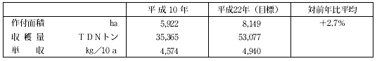 こうしたなか,平成12年に農林水産省が公表した「食料・農業・農村基本計画」では,食料自給率の向上,資源循環による農業の持続的発展,農業の多面的機能の発揮等が基本理念とされ,その実現に向けて同年3月に策定された「飼料増産推進計画」においては,飼料自給率の向上が重要な課題となっております。これを受け,県としても「岡山県飼料増産推進計画」を平成13年12月に策定し(平成14年「岡山畜産便り」4月号参照),また,市町村においても県下78市町村のうち6割を超える48市町村が個別の「飼料増産推進計画」を策定され,実質的な自給飼料の増産に取り組んでいるところです。その計画の内容は,飼料増産のための考え方,増産目標,推進方策等について記述しており,平成22年の目標を表2のとおり設定し,その達成に向けた広範な施策を展開することとしています。(作付面積は前年比+2.7%で推移)