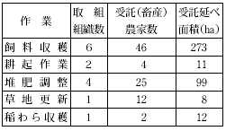飼料作物の作付拡大を図るための飼料作物調製用機械(3台),未利用資源の有効活用を図る目的で国産稲わらを利用拡大するための機械整備(8台)の他,日本型放牧実践のための牧場整備や,飼料増産に取り組む営農集団が単収の向上等の技術・営農実証した場合への助成事業(5集団)等。