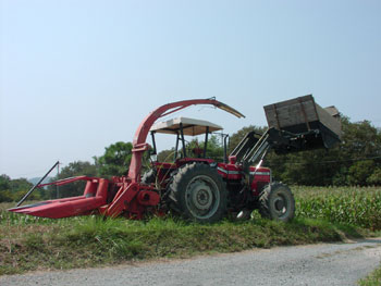 図2 コーンハーベスタによる収穫・細断 |