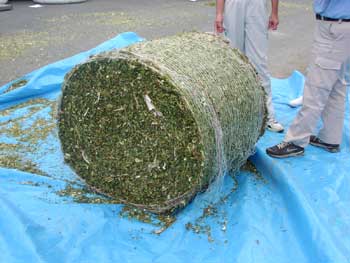 調製されたロールは直径は87.1p,平均重量は266.2sで同サイズの牧草ロールの約2倍の重さでした。含水率は刈取りステージがやや進んでいたためか68.9%と低めでした。乾物密度は最高値で高密度に梱包されていました。191.0s/m3の乾物密度(単位体積当たりの乾物重量)とは,高さが5m程度のサイロの底部と同じ圧力で梱包されているといえます。梱包ロス(ベーラからロールが放出されるときにこぼれた量)はできあがりのロール重量に対して1.4%,ラップロス(ラップ時にこぼれた量)は0.2%と少ないものでした。発酵品質もフリーク評価で「優」と良いものでした。