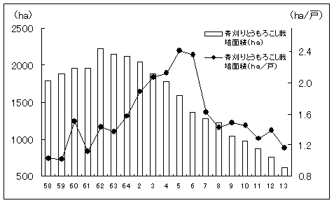 岡山県における青刈りトウモロコシの作付け面積は,転作により栽培面積が拡大した昭和62年の2,220haをピークに平成13年には614haと年々減少してきています(図1)。また,酪農経営1戸当たりの作付け面積も平成5年には2.4haでしたが,円高に伴う価格低下で購入飼料が増加し,平成13年には1.2haと半減しています(図1)。その他の減少した主な要因は,@収穫調製作業など,過重な労力を伴うこと,Aイノシシなどによる獣害などが考えられます。