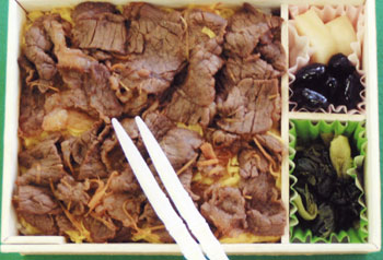 和風仕立てにされた味は和牛の風味,香りが絶妙。すし飯の中にもごぼうを入れた工夫で,和牛の味をさらに引き立てています。また,錦糸卵がすし飯と和牛の橋渡しになり,食べやすくなっています。おかずの中には,県産の特産品「黒豆」,漬け物,葉わさびも使用されています。