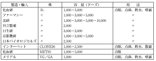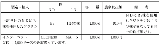 協会で現在取扱っているND生ワクチン並びにニューカッスル病・鶏伝染性気管支炎混合生ワクチンを紹介しますので,積極的にご利用いただきますようお願いします。