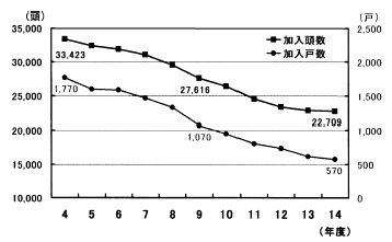平成14年度の加入頭数は22,709頭(570戸)で,これは平成4年度の加入頭数33,423頭(1,770戸)に比べ,10年間で10,714頭(1,200戸)の減少となっています。頭数,戸数は減少していますが,1戸当たりの加入頭数は平成4年度18.9頭であったものが,平成14年度は39.8頭とほぼ2倍に増加しています。今後とも戸数の減少と規模拡大化は続くものと思われます。