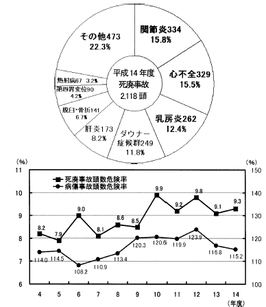 平成14年度の死廃事故頭数は2,118頭でそのうち死亡頭数が967頭でした。前年度より46頭の増加でした。病名別にみると,関節炎,心不全,乳房炎,ダウナー症候群(いわゆる産後起立不能症)の順に多く発生しています。関節炎は過去10年間以上トップの座にあり,家畜診療所では事故低減に苦慮しているところです。心不全は過去4〜5位でしたが,乳房炎をぬいて2位の座に上がってきました。また,死廃事故頭数危険率(死廃事故頭数÷加入頭数)は年々増加傾向にあり,平成14年度は9.3%となっています。