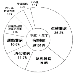 平成14年度の病傷事故頭数は26,154件で,前年度より507件の減少でした。病類別にみると。生殖器病36.2%,泌乳器病19.8%,消化器病11.7%となっています。また,病傷事故頭数危険率(病傷事故件数÷加入頭数)は増加傾向にありましたが,平成14年度は115.2%となっています。