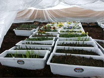 新庄村でも花壇用にホームセンターで花の土を購入する家庭が多い。そこで,堆肥とマサ土等を混合し,‘花の土(商品名:土力の賜)’として販売を開始しました。さらに,‘花の土’をプランターに入れ,チューリップやクロッカス等の球根やパンジーを植えて卒業式や入学式シーズンに村内の学校を対象として販売したところ大変好評を得,約700鉢を販売しました。
