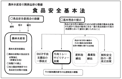 5法は@牛肉トレーサビリティ法(牛の個体識別のための情報の管理及び伝達に関する特別措置法),A農水省設置法改正,B食品の安全性確保のための農水省関係法の整備法,C飼料の安全性の確保及び品質改善に関する法律の一部改正,DHACCP支援法改正案(食品の製造過程の管理の高度化に関する臨時措置法改正法)―で,「消費・安全局」を新設する農水省設置法などは,7月1日,牛肉トレーサビリティ法については生産段階のものについては平成15年12月1日から,流通段階のものについては16年12月1日から施行される予定になっています。特に新しい組織として「食品安全委員会」が設置され,中立的な立場から安全について勧告などを行なうようにしていることと,従来の食糧庁が廃止され,本省サイドでは「消費安全局」地方では「地方農政事務所」が食品の安全対策を行なうように組織の改正がなされました。