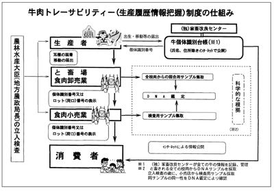 (1) 生産段階では牛を飼う酪農・肉用牛の農家は子牛が生まれたときに国(家畜改良センターが管理)に出生年月日,品種性別,牛の個体番号の届出が義務づけられます。同時に家畜改良センターが発行する耳標の装着も義務づけられ,耳標の取り外しや耳標の無い牛の売買も禁止されます。