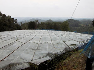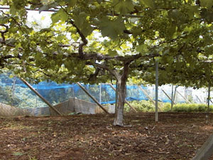 ブドウは,石や砂地でも育ち,乾燥地帯でも栽培が可能なため,多雨は病気の発生や甘みやうまみが落ちてきます。そのため,ビニールの屋根で雨を避けています。土壌に雨があたらないので,雨水による養分の流出がないため,土壌中の養分が過剰にならないよう心がけしなければなりません。