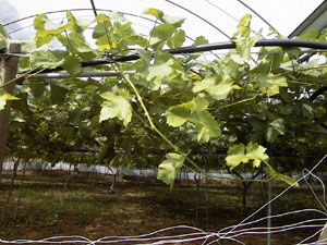 堆肥を施肥することで,減農薬栽培が可能になり,農薬散布は年間に5回しか行わずにすむそうです。通常のブドウの栽培において,1年間に農薬散布は十数回程度行われますが,三苫さんは農薬散布回数を5回に減らし,農薬の濃度も薄くしているそうです。しかも,堆肥を施肥しても病気の発生は通常の栽培とかわらないそうです。また,害虫も問題にならないそうです。ただし,畑に堆肥を施肥しているので,ミミズを食べにモグラが来るそうですが,根菜類野菜のように作物に被害はないそうです。