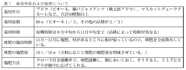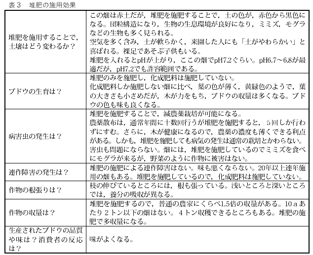 堆肥を施肥するので,通常の栽培にくらべ1.5倍の収量があると言われます。10aあたり2トン以下の畑はないそうで,10aあたり4トンも収穫できる畑もあるそうです。このように,三苫さんのところでは,堆肥の施肥で多収量になっています。多収量の上,さらに,生産されたブドウの味は良いそうです。