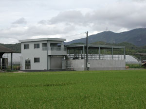 尿処理施設は,長船町役場の東約2㎞の住宅が途切れた水田の中,組合員である酪農家の牛舎の隣に整備され,日量6tの尿を処理する能力を有しています。