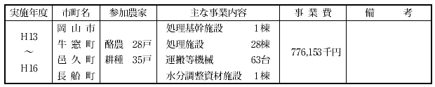 岡山局管内でも,関係補助事業等を活用して地域や農家の実状に即した処理施設を整備しており,主なものとしては,御津郡3町で実施した畜産基盤再編総合整備事業と,岡山市,邑久郡3町で実施している資源リサイクル畜産環境整備事業による施設があります。また,これらの事業に参加していない農家は1/2補助付リースや単県事業等を活用して施設整備を行っています。