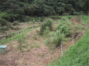 津山市の酪農家の提案で,耕作放棄地の景観保全を目的に柵原町安井地区の水田(約20a)に電気牧柵を張り,乳用牛の育成牛2頭を放牧しています。第1回目の放牧は7月8日から開始し,約4週間後に退牧しました。第2回目の放牧は10月8日から開始し,11月上旬まで放牧を行いました。現在は,きれいになった耕作放棄地に,イタリアンライグラス,トールフェスクなどの寒地型牧草を播種し,草地化を進めています。